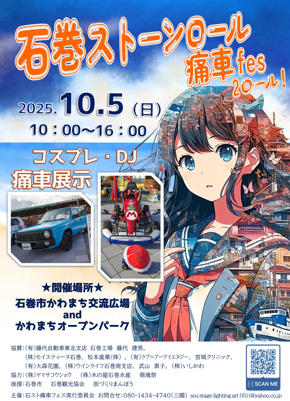 10/5(日)「石巻ストーンロール痛車フェス」が開催されます 痛車の展示をはじめ、アニソン等のDJ、歌やダンス、パフォーマーのショーが行われます! ■日付|2025年10月5日(日)■時間|10:00〜16:00■場所|石巻かわまち交流広場[GoogleMAP]かわまちオープンパーク[GoogleMAP]■詳細|公式X■主催|石スト痛車フェス実行委員会 Tweet Share Hatena 街なかイベント情報 コメント: 0 10/4(土) 「石巻一箱古本市2025」が開催されます 関連記事一覧 8/17(日)「石巻中央地区盆踊り大会」が開催されます。 2025.08.06 7/22(土)-23(日)「マンガッタンフェスティバル2023」が... 2023.07.21 9/28(日)「MAGフェスティバル」が開催されます 2025.09.19 6/21(土)-22(日)「かえるのピクルス ハッピーバルーン... 2025.06.19 10/8-9-10 「まちなかさんぽ!いしのまき鉄道フェスタ... 2022.09.25 7/7(木)「水辺で乾杯in石巻」が開催されます! 2022.06.29 12/10(日)「なべだべ!三陸鍋まつり」が開催されます! 2023.12.08 9/18(日)「あいプラザ 秋の文化祭」が開催されます!! 2022.09.16