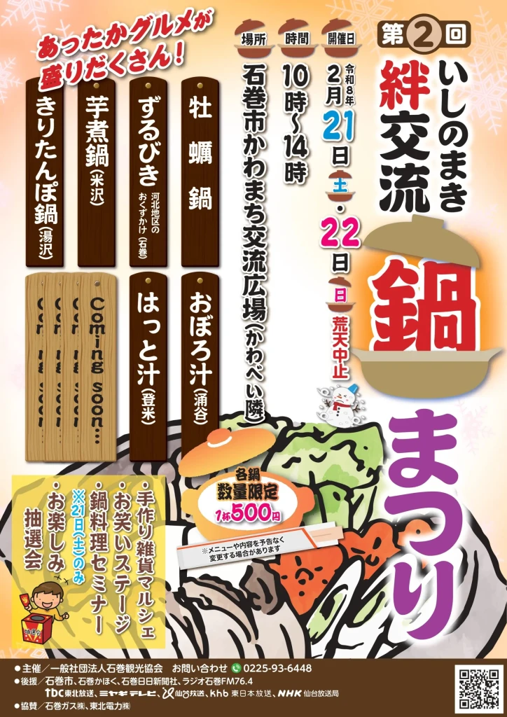 冬の石巻をあたたかく彩る、心も体もほっこりイベント!牡蠣鍋・郷土鍋・ご当地グルメが大集合!石巻をはじめ、米沢・湯沢・登米・涌谷など、各地の自慢の鍋料理を一度に集結します。