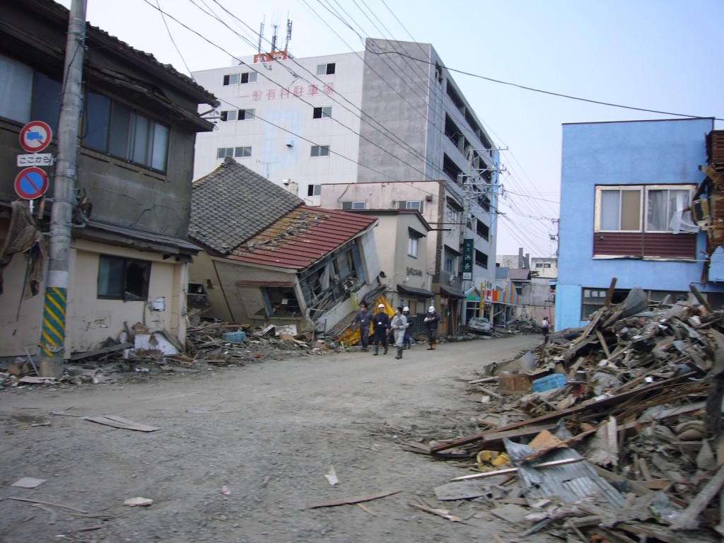 多くの商店が立ち並んでいた中央一大通り。海水や漂流物と共にたくさんの泥も流れ込んだため、泥の掻き出し作業も必要でした。時間が経つにつれ粉塵となって舞い上がるため、ゴム手袋やマスクは必須アイテムでした。