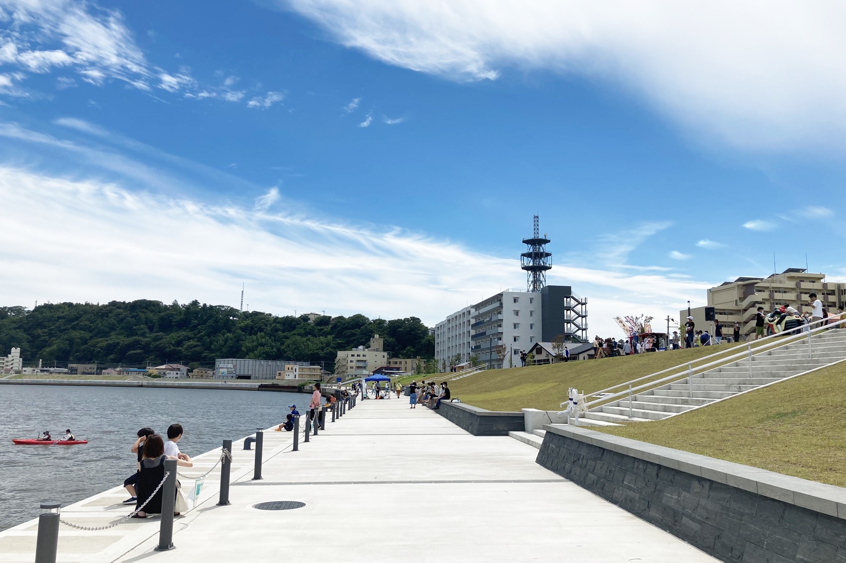 堤防上では季節問わず、音楽ライブやキッチンカー出店、映画上映会などさまざまなイベントが開催されています。堤防に隣接する『いしのまき元気いちば』にはテラス席があり、川の景色を見ながら食事を楽しめる他、田代島や網地島などの離島とまちなかを結ぶ『網地島ライン』の乗り場が整備され、島民や観光客が多く利用しています。