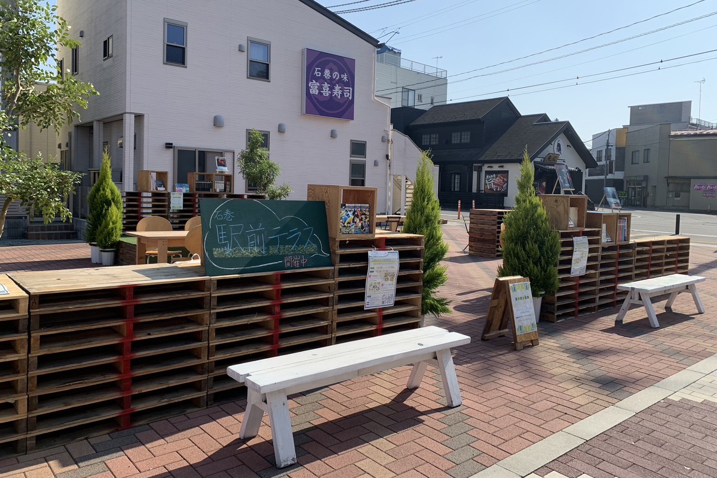 2023年には駅前の利活用を探るための社会実験が行われました。休憩スペースや読書本の設置、キッチンカー出店など、公共交通機関の待ち時間や待ち合わせ場所として利用されました。