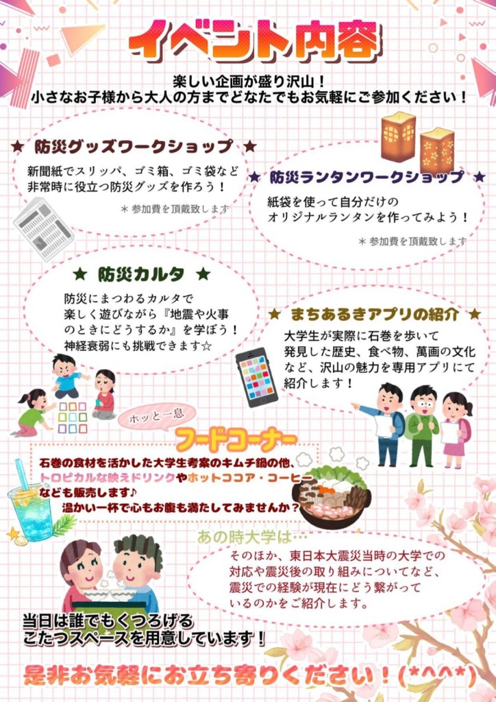 東日本大震災で亡くなられた方々への鎮魂の想いと、魅力的なまちづくりを経て復興し続ける今を、ゼミ生の考えた楽しい企画と共にお届けします。