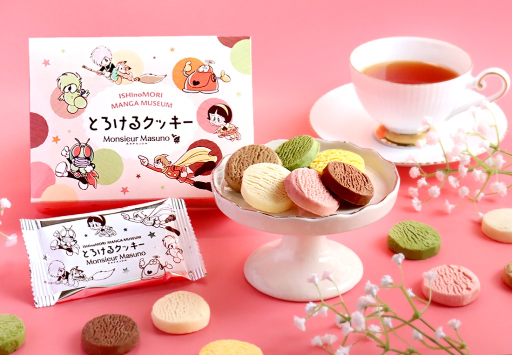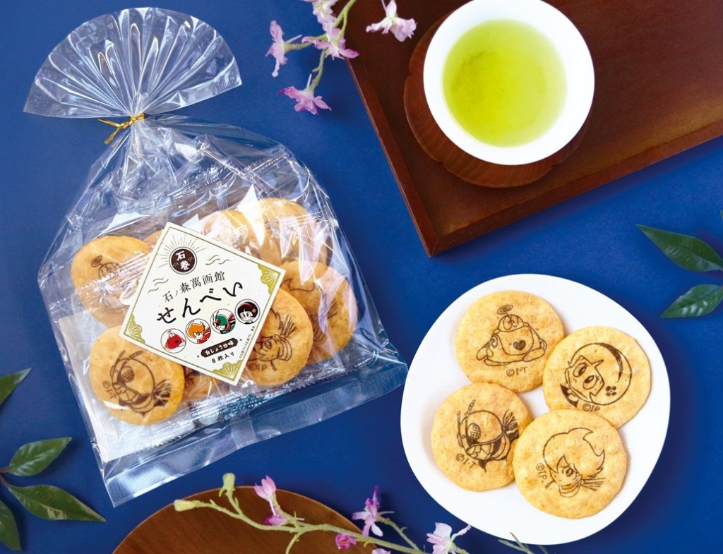 『がんばれロボコン』『サイボーグ009』『仮面ライダー』『さるとびエッちゃん』の絵柄がプリントされた煎餅です。しっかりとした歯応えがあり、あっさりとした白しょうゆ仕立てで、グッズショップの中でも特に人気なお土産商品です。煎餅はそれぞれ個包装となっているので、1枚ずつシェアすることもできますよ。