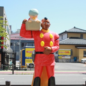 駅前大通り、お食事処“大もりや”の前にサイボーグ005に抱えられています。
