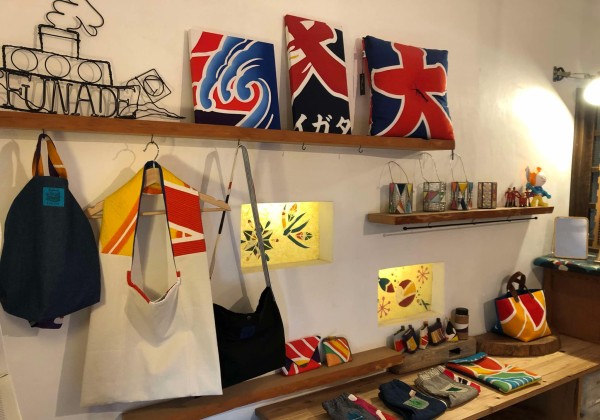 大漁旗を創造的再利用するオリジナルブランドを取り扱うお店「FUNADE studio」。石巻市の漁師さんから譲り受けた大漁旗を、...
